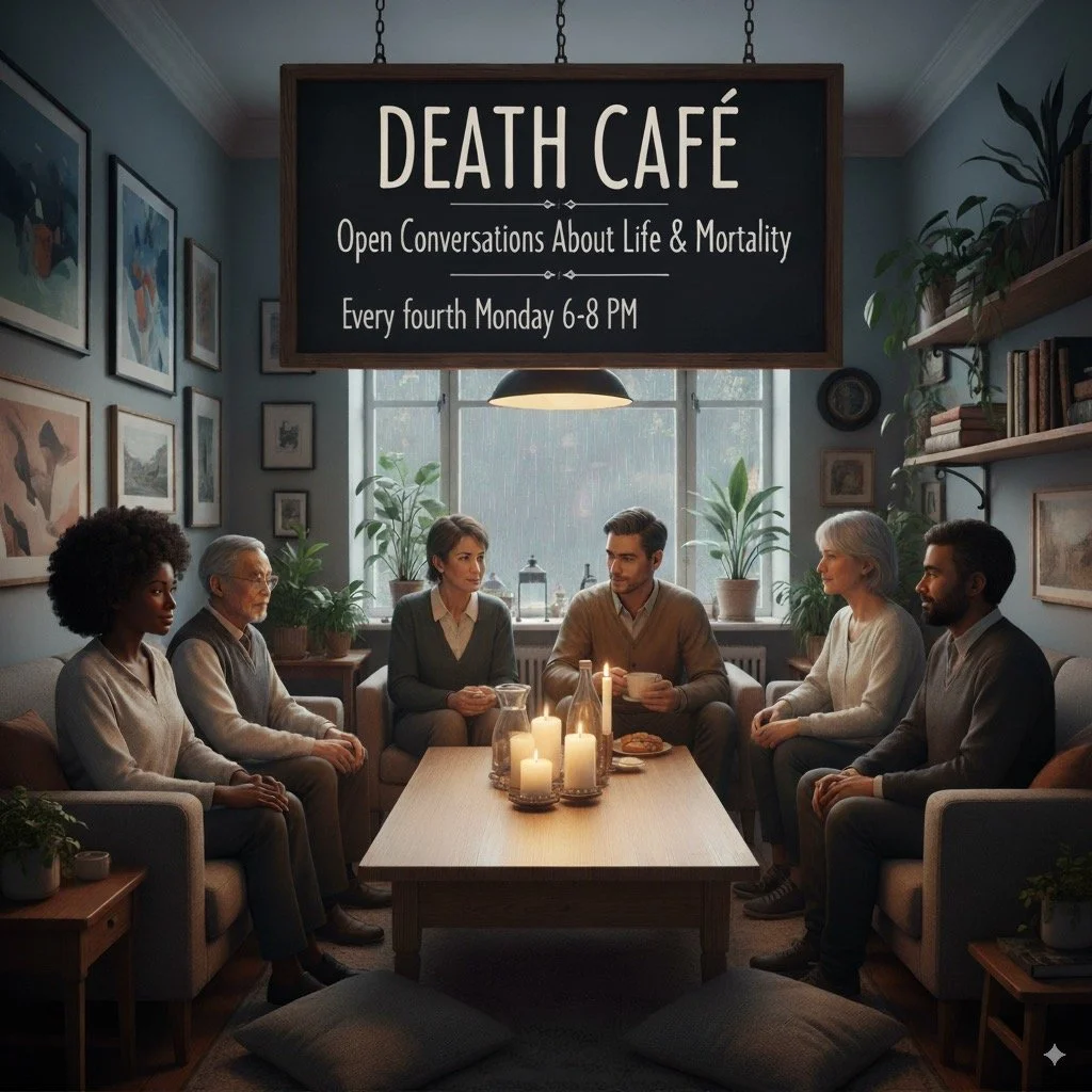 Join me for a Death Café—a small, lightly facilitated gathering where we have real, open conversation about living and dying. No lectures. No therapy. Just people talking honestly about this thing we all share. About living fully now with the end in mind.